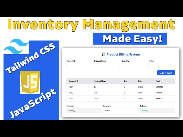Learn how to build a complete Inventory Management System from scratch using JavaScript and Tailwind CSS. In this step-by-step Tailwind CSS tutorial, we’ll cover everything you need to create a modern POS system and manage your products efficiently. Whether you’re a beginner or want to improve your web development skills, this CSS tutorial will guide you through designing a clean, responsive interface while implementing core inventory management functionality. By the end of this video, you’ll be able to: Build a working inventory management system using JavaScript Design a POS system with Tailwind CSS Apply modern CSS techniques for responsive layouts Track and manage products effectively Don’t forget to like, comment, and subscribe for more inventory management and web development tutorials!
